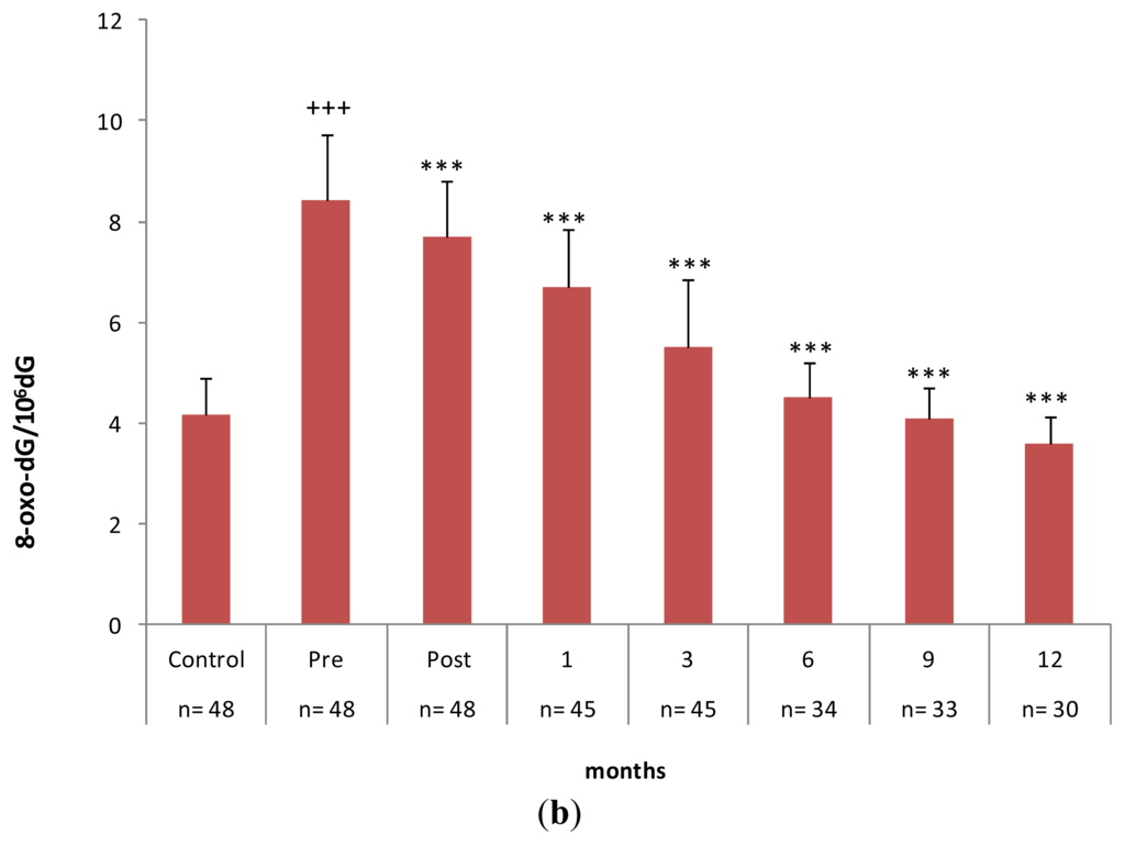 Time course effect of tumor resection on the levels of 8-oxo-dG in (a) urine and (b) peripheral mononuclear cells of gastric carcinoma patients. Control: healthy subjects; Pre: samples 24 h before surgical intervention; Post: 24 h and following months (1–12) after surgery. Results are expressed as means ± SD with the number of samples (n) indicated in the figure. +++p < 0.001 for the comparison of control subjects with cancer patients at the basal state; *** p < 0.001 for the comparison of post-surgical time periods with basal state in the patient group.