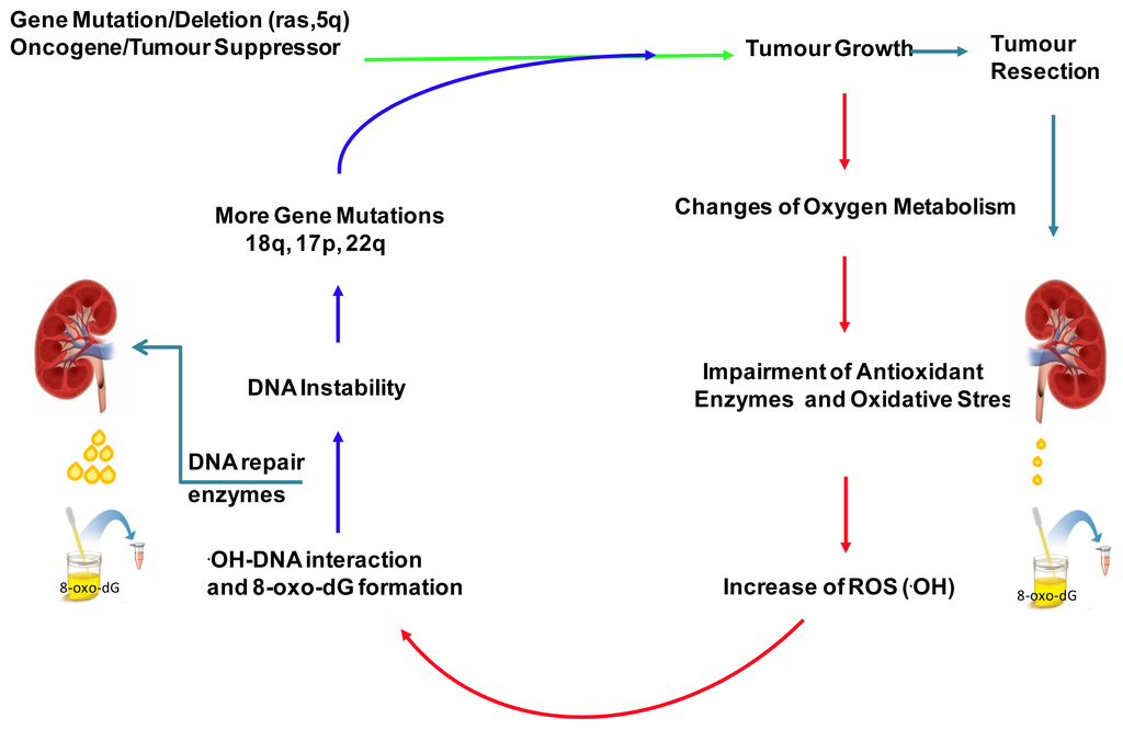 Schematic representation of the roles played by oxidative stress and oxygen free radicals in the induction of genetic instability during tumor progression. Increased oxidative stress and the production of hydroxyl radicals in tumor tissue interact and oxidize DNA, inducing the mutagenic base 8-oxo-dG, leading to increased gene instability in the tumor tissue. Different genetic alterations affecting oncogenes and tumor suppression genes take place during tumor growth and progression, contributing to the pathogenicity of the disease [19]. Induced expression of DNA repair enzymes results in the release of high levels of the damaged base in urine. The 8-oxo-dG levels in the urine of affected patients are reduced after tumor resection.