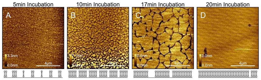 Time series of DOPC bilayer formation. Four separate samples of DOPC bilayers on mica were prepared that were incubated for (A) 5min; (B) 10min; (C) 17min and (D) 20min. Below each image is an illustration of the state of the lipid coverage across the mica surface. The time series experiment is a good way of determining that a complete single bilayer covers the mica surface. Without doing the time series experiment, it is very difficult to distinguish a complete single bilayer from multilayer or even bare mica. In addition, when faced with a DOPC sample with partial patchy coverage, it is a simple task to prepare a new sample with a slightly increased incubation time that will result in continuous coverage. All images were taken in pure water at room temperature.