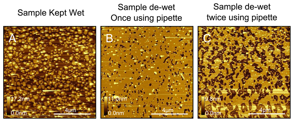 In Figure 10 we demonstrate the dewetting test for DPPC. In this case we removed the liquid from the fluid cell carefully until the surface was instantaneously dewetted, after which water was immediately replenished. The surface was re-imaged, and then the dewetting step repeated again followed by a final image being taken. As can be seen, holes are formed after the initial dewetting, which become larger after the second dewetting step. As with DOPC, this is a good test used to verify that the surface was completely covered with a first layer of lipid. In addition we can see that dewetting seems to preferentially remove the bilayer patches from the top as opposed to the vesicle structures. As with DOPC, we also tested the effect of various washes with increased force but again observed no change in the bilayer topography. We also tested the effect of washing with a buffer at a different ionic strength (PBS) followed by again washing with water, for which we also observe no change in the surface topography.