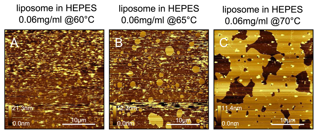 We see in Figure 11 that vesicles do not fuse to mica unless the deposition temperature is raised to 70 °C. Below this temperature, we see a combination of small fused bilayer patches and unfused vesicles.