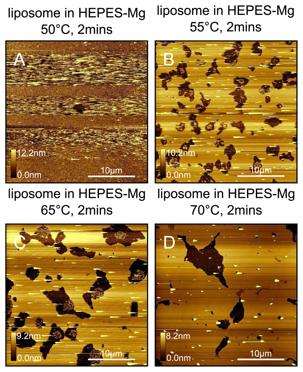 DPPC bilayers prepared from a HEPES-NaCl-Mg liposome solution. Bilayers prepared at (A) 50 °C; (B) 55 °C; (C) 65 °C; (D) 70 °C. When the sample plate is maintained at 50 °C we only observe a vesicle layer, which can be partially fused by the tip as indicated by the horizontal streaks in A. For 55 °C, 65 °C and 70 °C deposition temperatures, we observe extended regions of fused bilayer. More domains are observed for the highest temperatures. Samples were prepared using liposomes in HEPES-Mg at exactly the same concentration (0.06mgml−1 ) and deposition time (2min) as for the HEPES-NaCl samples shown in Figure 11.