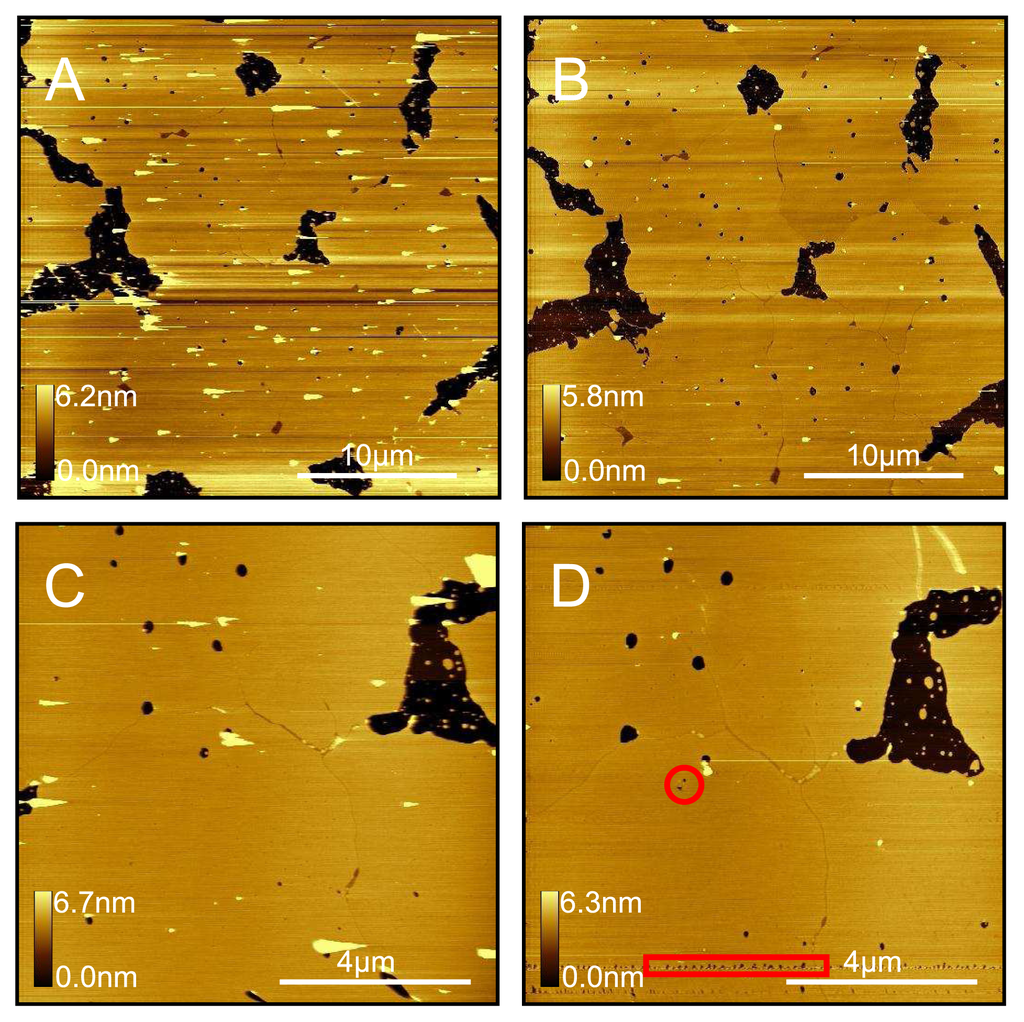 DPPC sample prepared from HEPES-NaCl-Mg liposome solution and incubated at 60 °C for 60min. (A) Light force scanning highlights vesicles; (B) Higher force scanning makes the sample appear more continuous than it really is. Although some vesicles were dislodged and swept away, the smoother appearance of the surface is mostly due to the tip tracking across the vesicles better; (C) Extended regions of defect-free bilayer are observed; (D) A few lines of (C) were scanned with a high force and then scanned lightly again (area enclosed by red box). We see holes due to the hard scanning. We also see holes disappearing even with relatively light scanning (area enclosed by red circle), indicating that the DPPC bilayers are delicate and dynamic, although much less so than DOPC.