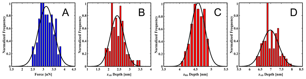 In order to have a more accurate reflection of the bilayer properties, it is necessary to repeat the force-distance measurements several times. As shown in Figure 16 we have collected data for 136 approach–retract cycles for a single tip. The mean values are FB = 3.1 ± 0.3 nN, zA–B = 2.4 ± 0.3 nm, zB–D = 4.6 ± 0.2 nm, zA–D = 7.0 ± 0.3 nm.