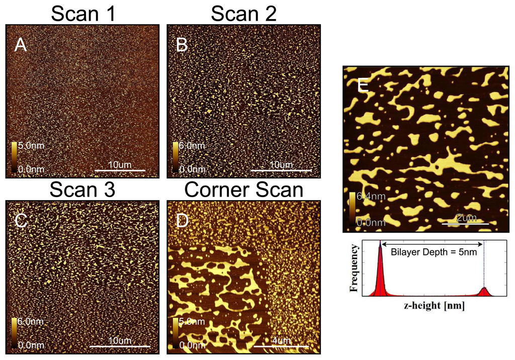 Tip induced DOPC gathering effects on sparsely covered samples indicating both the fluidity of DOPC and the weak attraction of DOPC with mica. (A) DOPC sample prepared with a very sparse coverage of DOPC; (B) and (C) successive scans of sample in A cause the lipid to be drawn together, making larger patches; (D) The effect is most clearly seen when a corner at the boundary between a previously scanned region, and an untouched region is scanned; (E) The distribution of pixel heights shows two distinct populations, representing the mica surface and the surface of the bilayer. The bilayer depth is found by subtracting the Gaussian fitted peaks of the two populations. The value of 5 nm obtained here agrees well with expected values.
