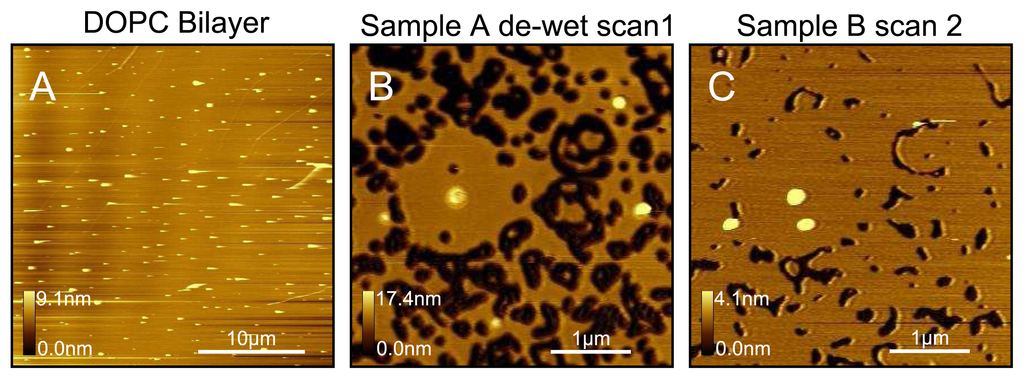 Another useful technique for testing a bilayer surface is the de-wetting approach. In Figure 3A we observe a predominantly flat sample, except for some protrusions. It is difficult from this single image to be certain as to whether we are observing a sample predominantly consisting of uncoated mica but with a few vesicles adsorbed to the surface, or whether there is a complete bilayer covering the mica but with a few vesicles either adsorbed or existing in a trapped state [6,43,45]. By simply removing some of the water from the fluid cell so that the surface de-wets for a few seconds and then replacing the water quickly, we observe many holes as shown in Figure 3B. This clearly demonstrates that the original surface was in fact a complete bilayer. Again the fluidity of this DOPC sample is demonstrated when we scan some time later, over exactly the same area, as in Figure 3C, where we observe the holes to have decreased in size. In contrast to the de-wetting technique, we observe that increasing the strength of the washing stream or the volume used to wash the sample has no perceivable effect.