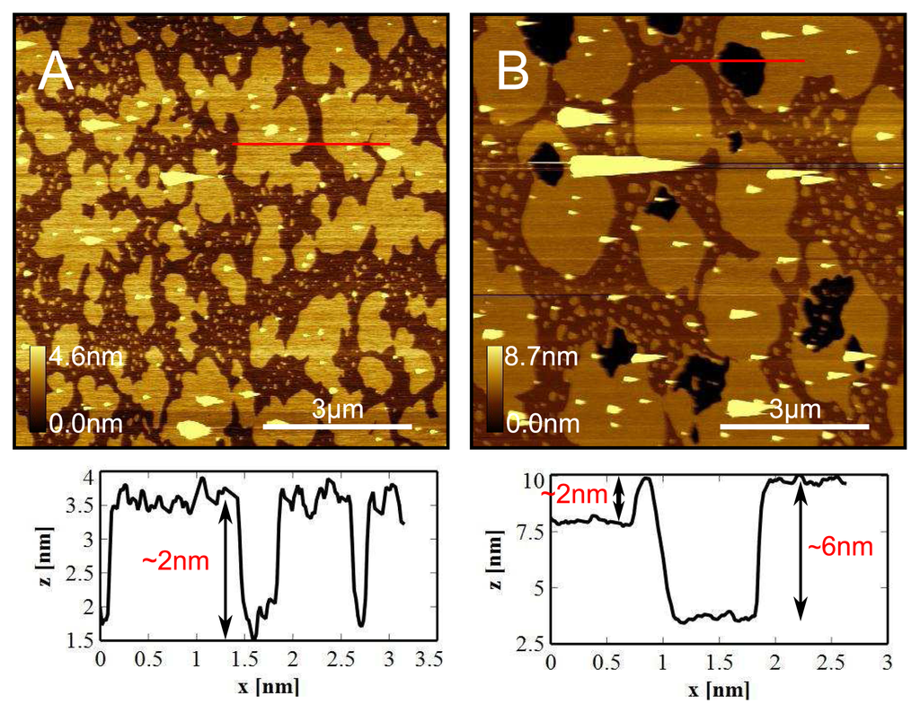- Mingeot-Leclercq, M.P.; Deleu, M.; Brasseur, R.; Dufrene, Y.F. Atomic force microscopy of supported lipid bilayers. Nat. Protoc 2008, 3, 1654–1659. [Google Scholar]