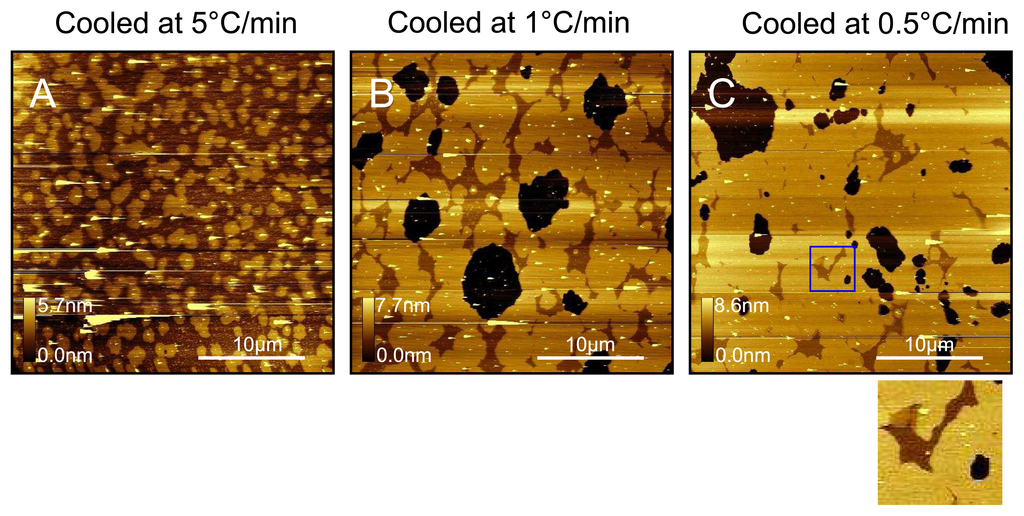 Effect of cooling rate on DPPC bilayers in water. All samples were prepared by incubation with DPPC liposome solution in water at 60 °C and incubation for 5min followed by cooling to room temperature at (A) 5 °Cmin−1 ; (B) 1 °Cmin−1 ; (C) 0.5 °Cmin−1 . The region enclosed by the blue box has been enlarged and is shown below. For this image of DPPC at room temperature, we see three different types of domains with the lowest two being 1.1 nm and 0.6 nm below the upper domain.