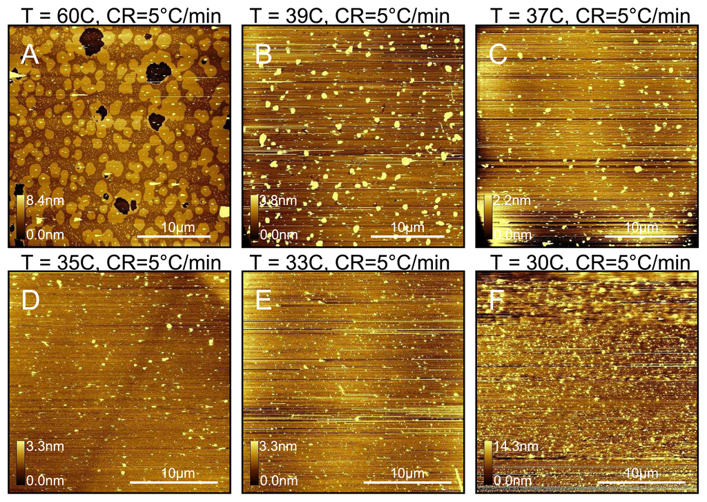 We also tested the effect of changing the temperature of the mica in the fluid cell. When only 39 °C is maintained, we see a dramatic reduction in the number of lower domains compared with a sample prepared at 60 °C as shown in Figure 6. The trend of decreasing lower domains with decreasing temperature continues down to 33 °C where the domains are almost completely eliminated. However, at 30 °C we start to observe unfused vesicles. This suggests that although the transition temperature for a DPPC liposome solution is 41 °C, they will fuse with mica in pure water at and above 33 °C. Thus it seems the minimum temperature for complete vesicle fusion is well below the lipid transition temperature. However, for these samples prepared between 33 °C and 39 °C, we observe many more protrusions across the surface, suggesting that trapped vesicles are more likely to form at these lower temperatures. Reimhult et al. [45] made the same observation with eggPC (transition temperature ~ −15 °C) using the Quart Crystal Microbalance technique. We also tested a sample prepared at 33 °C and cooled at 0.5 °Cmin−1, for which we observe the lower domains completely eliminated (data not shown as very similar to Figure 6E).
