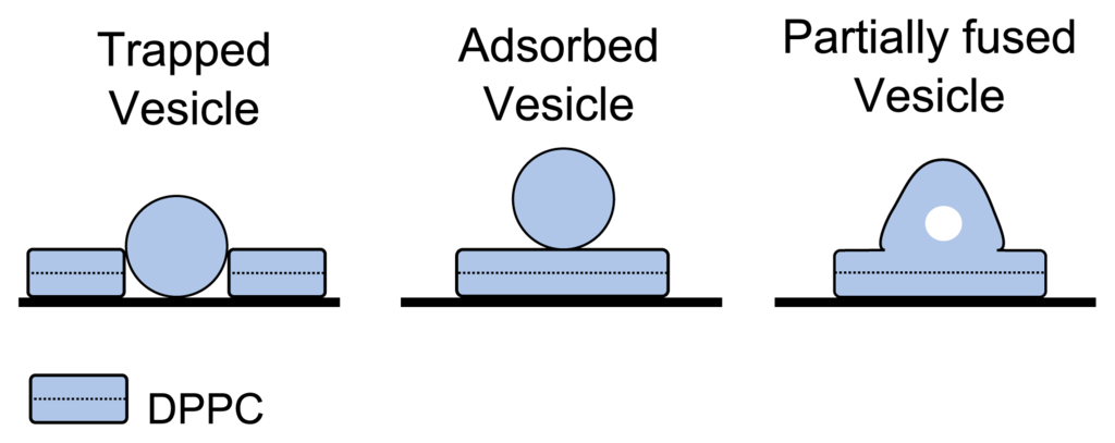 Assigning identity to protrusions observed in bilayer samples. The schematics illustrate three possible variants that may lead to the protrusions seen in DPPC bilayer samples: trapped vesicle, adsorbed vesicle and partially fused vesicle.
