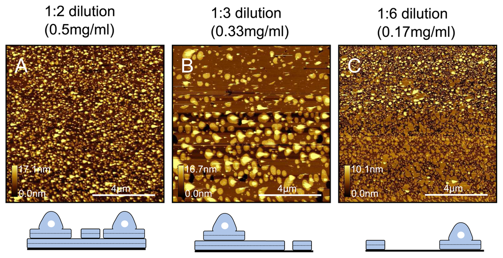 Dilution test for samples prepared at 33 °C. DPPC samples in water were prepared at (A) 0.5mgml−1 ; (B) 0.33mgml−1 and (C) 0.17mgml−1 . By diluting the liposome solution to the point where bare mica is seen in the samples, we are able to see the very initial stages of vesicle fusion, which indicate protrusions are partially fused vesicles. Below: Schematics illustrating proposed generalised models for respective samples.