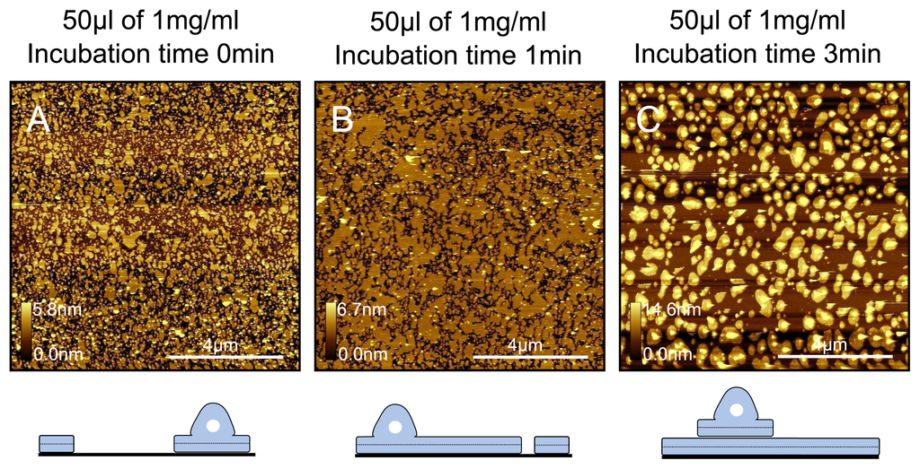 Interestingly, we observe a very similar trend when varying the incubation time of a 1mgml−1 DPPC solution. As shown in Figure 9, we vary the incubation time from 0min (sample immediately washed after deposition, actual incubation time < 2 sec) to 3min. At the shortest incubation time, we observe patchy coverage across the mica surface, including partially fused vesicles. The coverage increases in a time-dependent manner, and at the longest incubation time we again observe a complete bilayer but with lipid patches and partially fused vesicles across the surface. Based on this, it seems that an increase in incubation time is equivalent to an increase in concentration. Another important point to note is that in this case these samples were prepared at room temperature. It seems therefore that although vesicles are not able to completely fuse when at lower concentrations (~ 0.3mgml−1 ) and below 33 °C, vesicles will completely fuse even at room temperature when the concentration is high enough. Therefore, this suggests that there is interdependence between the concentration and the temperature at which vesicles will fuse.