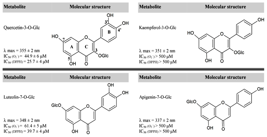 Absorbance maxima and ROS-quenching capacity of mono-(apigenin and kaempferol) and dihydroxy B-ring-substituted (quercetin and luteolin) flavonoid glucosides (glc). Absorbance spectra were recorded in phosphate buffer at a metabolite concentration of 50 μM. IC50 denotes the molar concentration required to reduce by 50% the concentrations of superoxide anion (O2−) and the synthetic free radical DPPH (2,2-diphenyl-1-picrylhydrazyl) as estimated following the protocols reported in [10,17].