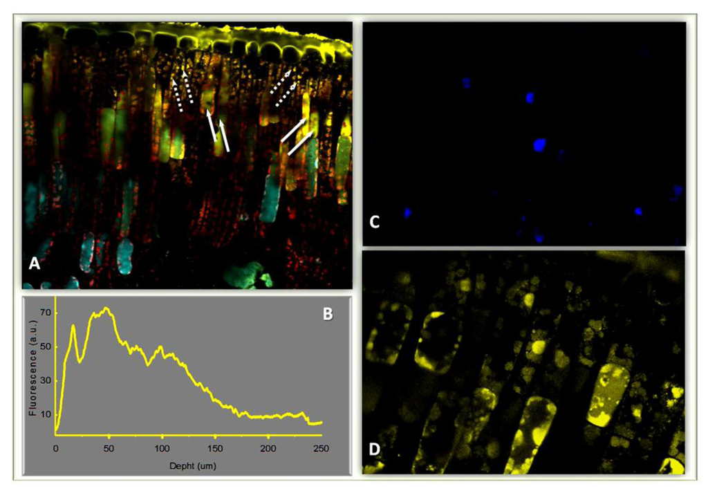 Inter and intracellular distribution of dihydroxy-B-ring-substituted flavonoid glycosides in leaves of L. vulgare leaves acclimated to full sunlight irradiance. Cross sections were stained with Naturstoff reagent and fluorescence images recorded in a Confocal Laser Scanning Microscope flowing the protocols of [10]. In brief, specimens were excited at 488 nm and fluorescence recorded at 580 ± 10 nm: this excitation-emission set-up has been previously reported to exclusively visualize flavonoids, in particular flavonoids with a catechol group in the B-ring of the flavonoid skeleton [10]. Dihydroxy flavonoids accumulate mostly in the adaxial tissue (up to a distance of 150–170 μm from adaxial surface, as revealed by profiles of their fluorescence acquired at 580 nm, reported in (B). Dotted and solid white arrows in (A) indicate flavonoids in the chloroplast and the vacuole, respectively. Dihydroxy flavonoids are located in the nucleus of mesophyll cells. Nuclei were stained with both DAPI (to visualize the nucleus) and Naturstoff reagent and images were recorded in the blue-channel for detecting DAPI fluorescence (C) or the yellow-channel for detecting flavonoid fluorescence (D).