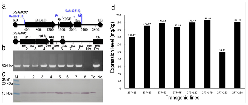 Generation and screening of the transgenic plants highly expressing recombinant basic fibroblast growth factor (bFGF) in rice (Oryza sativa) endosperm (OsrbFGF): (a) Maps of plasmids of pOsPMP277 and pOsPMP05; (b) Agarose gel for screening positive transgenic lines by polymerase chain reaction (PCR) amplification with primers F1 and R1 and (c) identification of the transgenic lines from T1 seed expressing OsrbFGF by Western blotting; (d) Quantitation of expression levels of the individual T1 transgenic seeds. Lane M, marker; Lane 1, 277–45; Lane 2, 277–47; Lane 3, 277–53; Lane 4, 277–75; Lane 5, 277–122; Lane 6, 277–179; Lane 7, 277–223; Lane 8, 277–238; Pc, plasmid pOsPMP277 (b) and 350 ng of recombinant bFGF from E. coli (c); Nc, wild type TP309 DNA (b) and crude protein extracts from the seed of wild type TP309 (c).