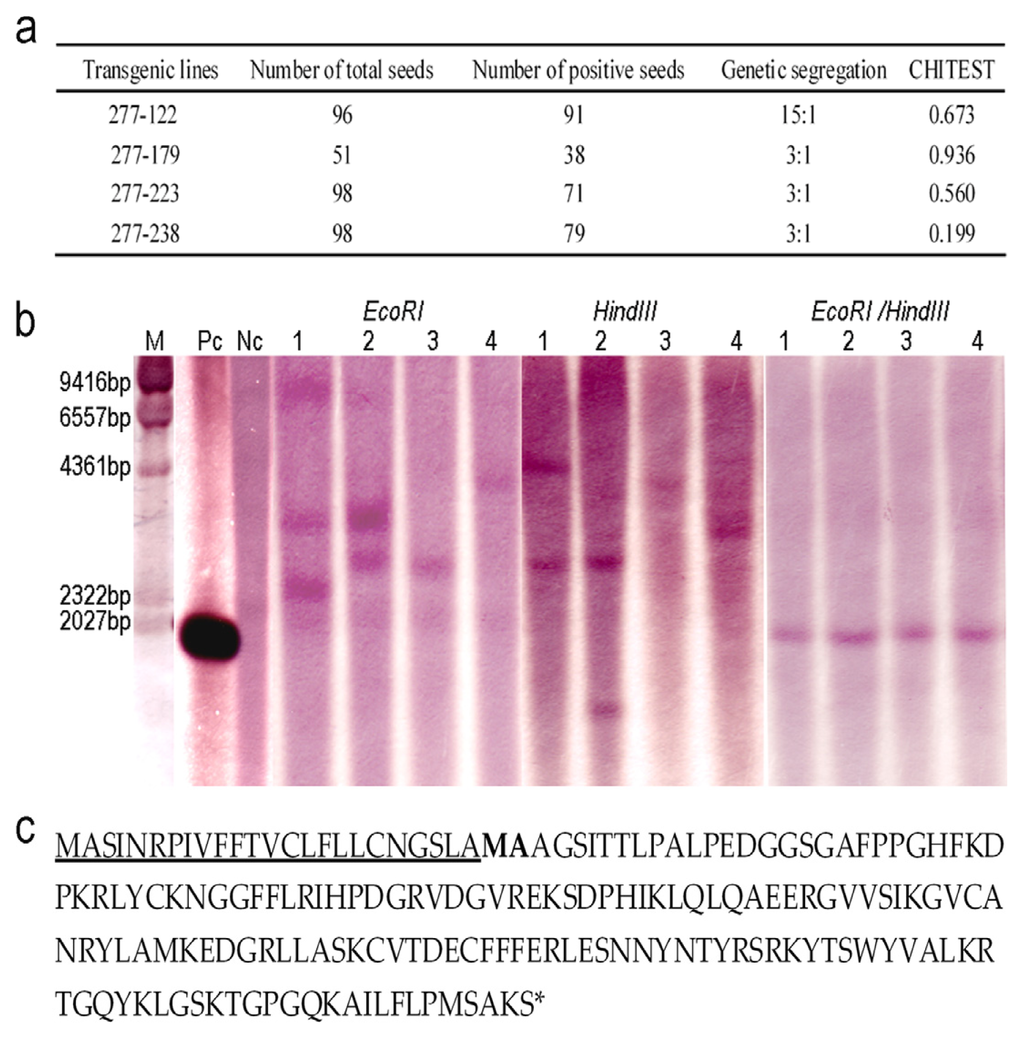Genetic analyses of the transformants by transgene segregation and Southern blotting: (a) Genetic segregation of T1 seeds from transgenic lines; (b) Southern blot analysis of four transgenic lines and TP309. Genomic DNA was digested with EcoRI or HindIII and EcoRI/HindIII, and plasmid pOsPMP277 and wild type TP309 genomic DNA were digested with EcoRI/HindIII. Lane 1, 277–122; Lane 2, 277–179; Lane 3, 277–223; Lane 4, 277–238; M, marker (Lambda DNA digested by HindIII); Pc, positive control (pOsPMP277 DNA with length of 1983bp); Nc, negative control (Wild-type TP309 genomic DNA); (c) Amino acid sequences of the signal peptide and OsrbFGF. The signal peptide is underlined and two missed amino acids (Met and Ala) are in bold.