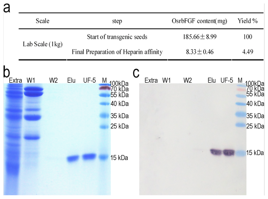 Purification of OsrbFGF from the seeds derived from transgenic line 277–179. (a) The recovery rate of OsrbFGF for purification step; (b) sodium dodecyl sulfate polyacrylamide gel electrophoresis (SDS-PAGE) with Coomassie blue G250 staining for each processing step; (c) Western blotting analysis of each processing step. Extra: the crude extraction; W1: wash 1; W2: wash 2; Elu: Elutant; UF-5: ultrafiltration in size of 5 kDa; M: molecular mass marker.