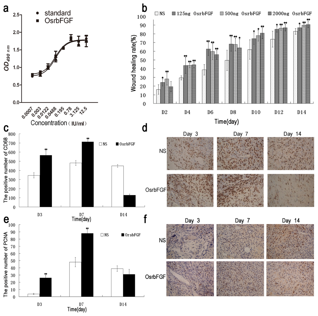 Biological activity assay of OsrbFGF in vitro and in vivo. (a) The cell proliferation assay of OsrbFGF with NIH/3T3 cells; (b) Wound healing rate on Day 2, Day 4, Day 6, Day 8, Day 10, Day 12 and Day 14. The diagrams of the positive cells of CD68 (c) and proliferation of cell nuclear antigen (PCNA) (e) on Day 3, Day 7 and Day 14 (t-test *p < 0.05, **p < 0.01). The microimages of immune autoradiography of (d) CD68 and (f) PCNA (x40). For the immunohistochemistry assay, a dosage of 500 ng OsrbFGF was chosen and the positive cells with CD68 and PCNA were counted. NS means normal saline.