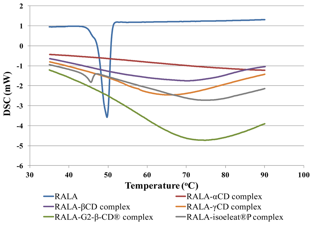 Complex formation of RALA and the different CDs can be evaluated using DSC, since the melting, boiling or sublimation points of these complexes usually shift to a different temperature compared to the melting or boiling point of free lipoic acid.