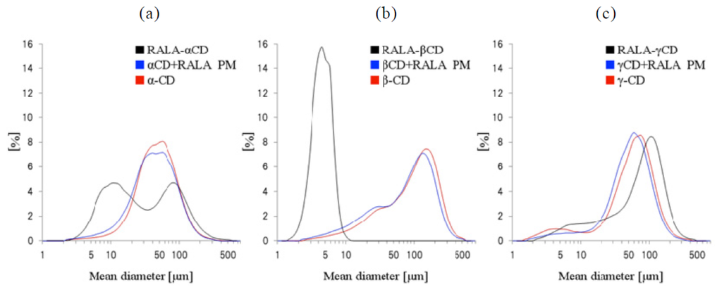 To further examine the particle morphology, we conducted a particle size distribution analysis of the CDs, physical mixtures and RALA-CD complexes using a particle size distribution analyzer (Figure 6). In this measurement, α-CD showed a single peak, and the mean median diameter was 43 μm. The RALA + αCD physical mixture also showed only one peak, and the mean median diameter was 40 μm. Contrarily, RALA-αCD showed two peaks, one at a smaller diameter (13 μm) and one at a larger diameter (77 μm) than the peak of α-CD.