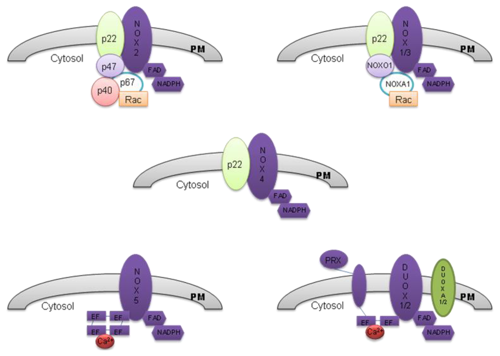Reactive oxygen species (ROS) are formed during aerobic metabolism and are much more reactive than molecular oxygen. For many years, they were only associated with cell injury, but currently, they are viewed as important components of the biological processes [1–5]. In aerobic organisms, ROS can be generated from different sources, including the mitochondrial electron transport chain, xanthine oxidase, myeloperoxidase, lipoxygenase, and uncoupled endothelial NO synthase, but the only enzyme family that produces ROS as its main product is the nicotinamide adenine dinucleotide phosphate (NADPH) oxidase family (NOX enzymes) [6]. The NOX family comprises seven members: NOX 1–5 and the dual oxidases (DUOXs) DUOX 1 and DUOX 2. The NADPH oxidase complexes were initially thought to be specific to phagocyte cells, but these enzymes are now recognized as being almost universally expressed in nonphagocytic cells.