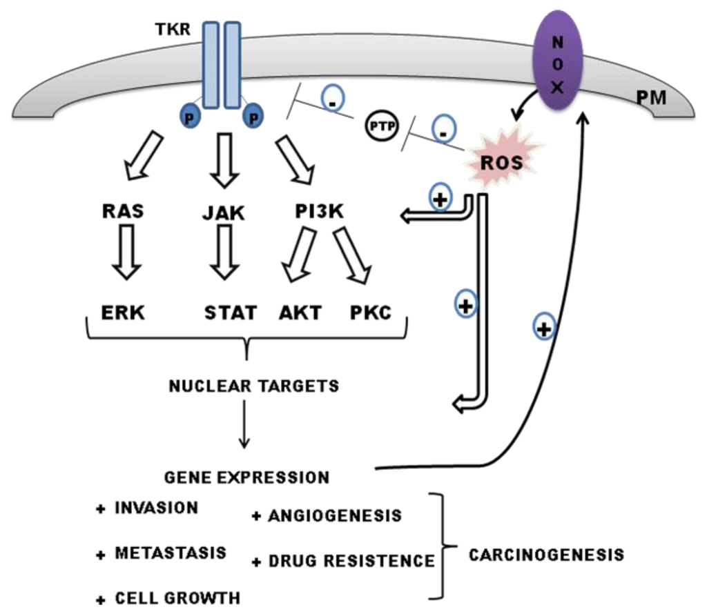 Reactive oxygen species (ROS) can act in a synergic manner with tyrosine kinase receptor (TKR) to promote carcinogenesis. TKR can enhance the expression/activity of NOX isoforms. The ROS generated from NOX activity can sustain the activation of TKR signaling pathways and of transcription factors involved on carcinogenesis through inhibition of PTP activities.