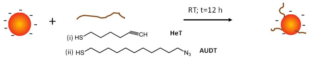 - Bartczak, D.; Kanaras, A.G. Diacetylene-containing ligand as a new capping agent for the preparation of water-soluble colloidal nanoparticles of remarkable stability. Langmuir 2010, 26, 7072–7077. [Google Scholar]