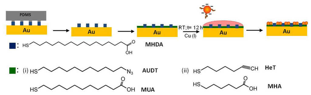 - Love, J.C.; Estroff, L.A.; Kriebel, J.K.; Nuzzo, R.G.; Whitesides, G.M. Self-assembled monolayers of thiolates on metals as a form of nanotechnology. Chem. Rev 2005, 105, 1103–1170. [Google Scholar]