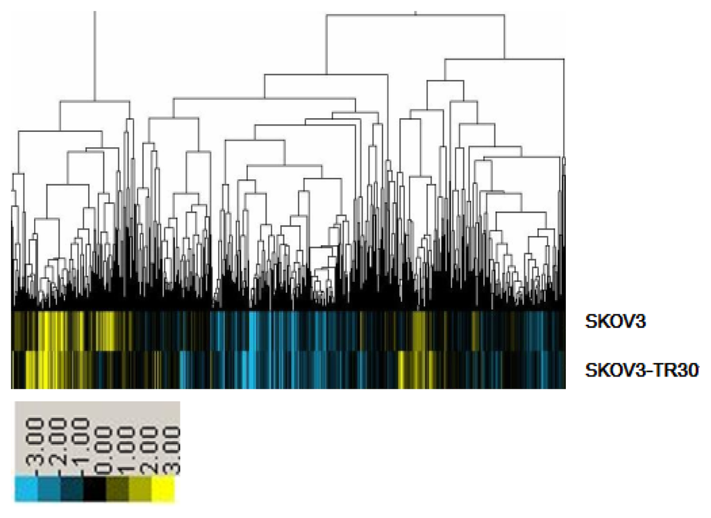 A microarray platform was used to analyze and compare the pattern of miRNA expression between the parental SKOV3 cell line and its counterpart paclitaxel resistant SKOV3-TR30 cell line. The expression profiles of 171 miRNAs changed significantly: 69 upregulated miRNAs (miR-17, miR-19b, miR-92-1) and 102 downregulated miRNAs (miR-134, miR-34, miR-196b) in SKOV3-TR30 cells as compared with SKOV3 cells (Figure 1).