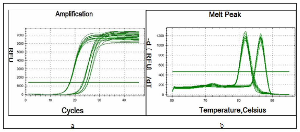 Amplification Curve and Melting Curve of miR-17~92 Expression in SKOV3, SKOV3-TR30, SKOV3-TR30-m-PTIP-Sponge all cells and the SKOV3-TR30-m-PTIP-GFP cells Detected by real-time PCR. (a) Amplification Curve of Expression of miR-17~92; (b) Melting Curve of Expression of miR-17~92.