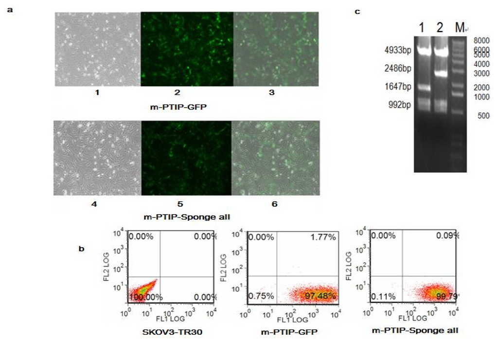(a) Determination of stable virally transduced SKOV3-TR30-m-PTIP-Sponge all cell line and its vector-only control SKOV3-TR30-m-PTIP-GFP by Fluorescence Microscope. (100×) 1, 2, 3: transduced by m-PTIP-GFP empty plasmid 1, white field, 2, with fluorescence, 3, the integration of 1 and 2. 4,5,6: transduced by m-PTIP-Sponge all inhibit plasmid, 4, white field, 5, with fluorescence, 6, the integration of 4 and 5; (b) Determination of stable virally transduced SKOV3-TR30-m-PTIP-Sponge all cell line and its vector-only control SKOV3-TR30-m-PTIP-GFP using Flow Cytometry. Ratio of cells expression green fluorescent protein for SKOV3-TR30, SKOV3-TR30-m-PTIP-GFP and SKOV3-TR30-m-PTIP-Sponge all were 0.00, 97.48% and 99.79%; (c) Plasmid Restriction Enzyme Digestion Results 1: m-PTIP-GFP empty plasmid, 2: m-PTIP-Sponge all inhibit plasmid, M: Marker.