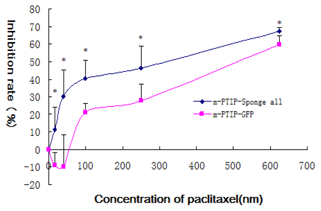 We further study the effects of miR-17~92 expression on the proliferation of SKOV3-TR30 using MTT assay. Paclitaxel inhibited cell proliferation in both SKOV3-TR30-m-PTIP-Sponge all and SKOV3-TR30-m-PTIP-GFP, and with increased concentration of paclitaxel the inhibitory effects was more obvious. Further more, SKOV3-TR30-m-PTIP-Sponge all cells had significantly reduced cell proliferation (p < 0.05) compared with SKOV3-TR30-m-PTIP-GFP (Figure 4) and when the concentration of paclitaxel was 100 nm, the inhibition rate difference was most obvious, which is 40.407% of SKOV3-TR30-m-PTIP-Sponge all cells and 20.934% of SKOV3-TR30-m-PTIP-GFP. IC50 of paclitaxel of SKOV3-TR30-m-PTIP-Sponge all cells and SKOV3-TR30-m-PTIP-GFP cells is 470.80 nM and 170.13 nM respectively.
