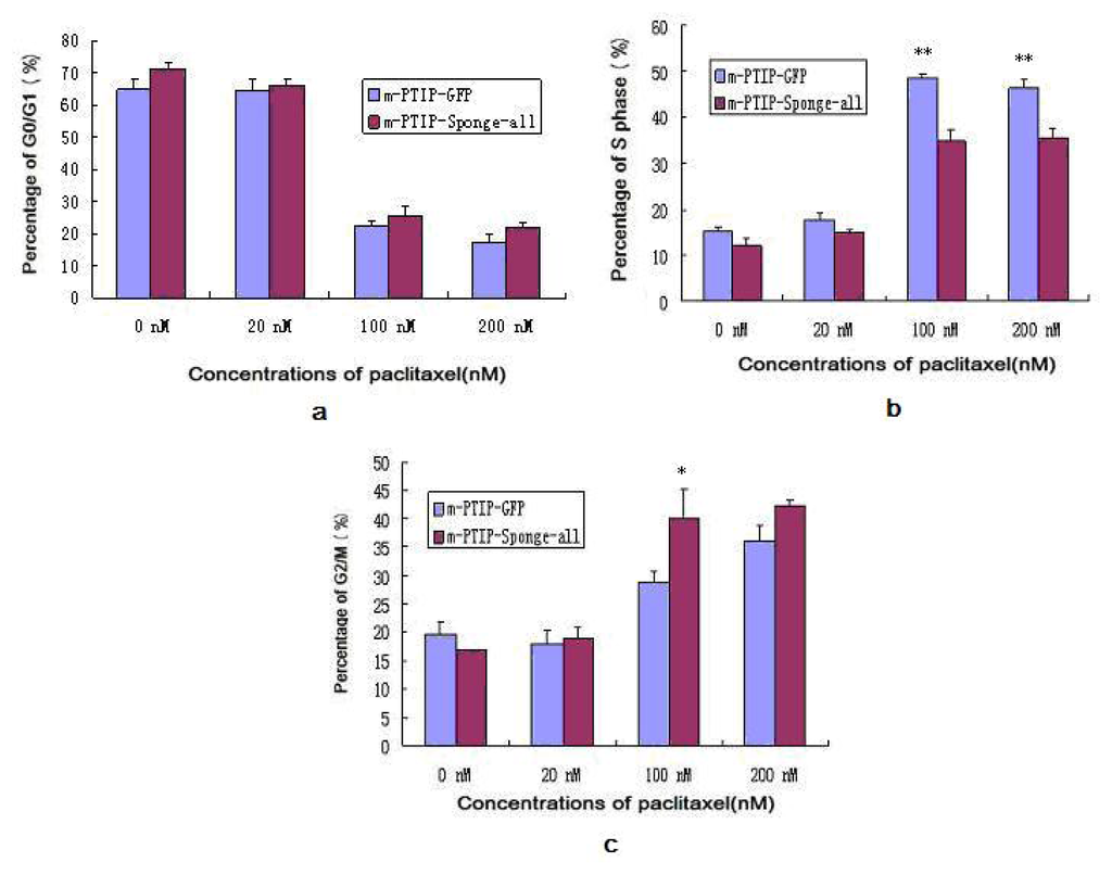 Results of Cell Cycle of SKOV3-TR30 after transduction. (a) The Proportion of G0/G1 Phase; (b) The Proportion of S Phase; (c) The Proportion of G2/M Phase (* respects the group transduced by m-PTIP-Sponge all inhibit plasmid vs. the group transduced by m-PTIP-GFP empty plasmid in the same concentration of paclitaxel, p < 0.05; ** respects the group transduced by m-PTIP-Sponge all inhibit plasmid vs. the group transduced by m-PTIP-GFP empty plasmid in the same concentration of paclitaxel, p < 0.01).