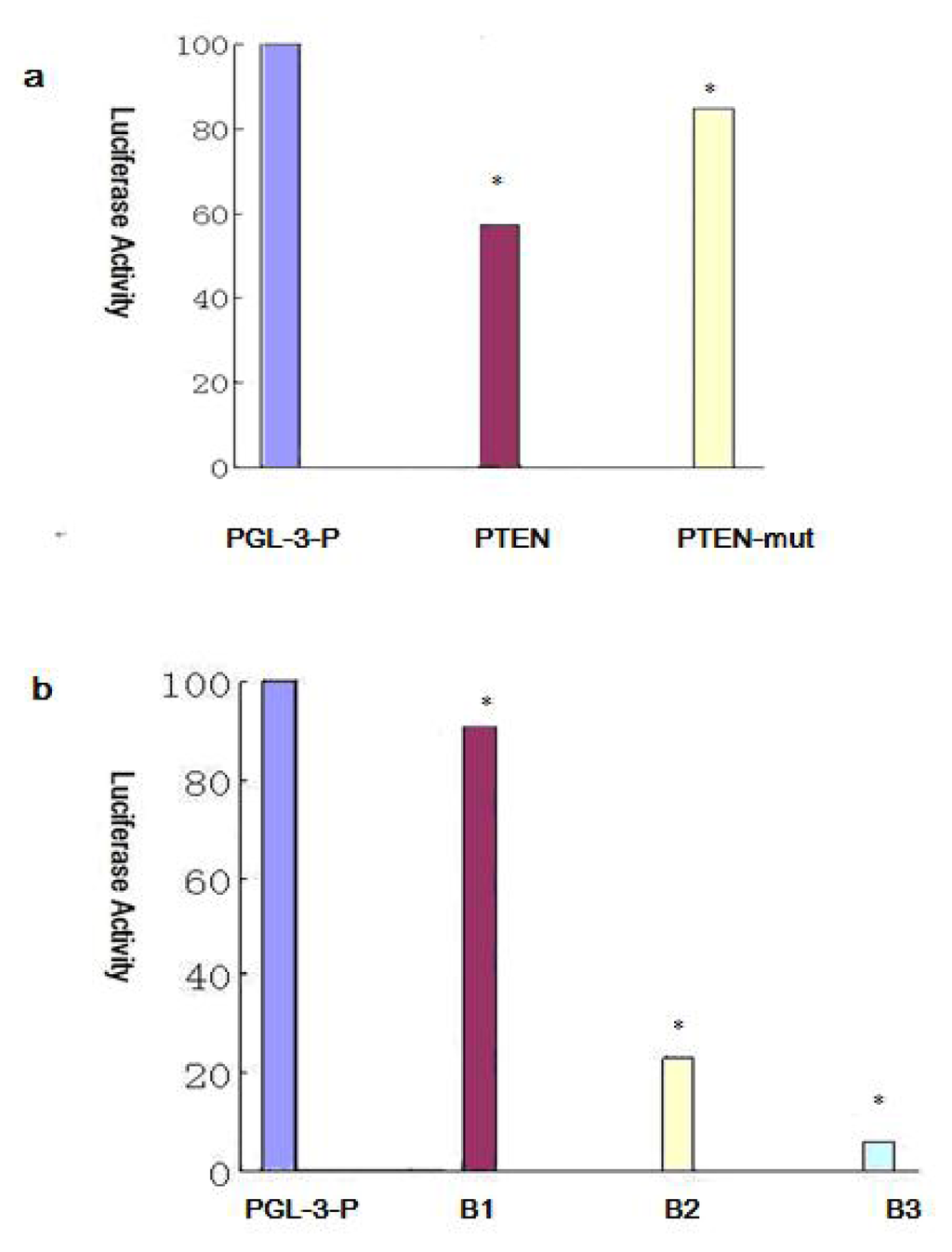 (a) Overexpression of miR-17~92 in HEK293 cells inhibited the luciferase activity of the PTEN 3′-UTR reporter plasmid. The 3′-UTR reporter plasmids PTEN or PTEN mut were co-transfected with TMP2-miR-17~92 into HEK293 cells. The activity of firefly luciferase was normalized to that of Renilla luciferase. (b) Overexpression of miR-17~92 in HEK293 cells inhibited the luciferase activity of the BIM 3′-UTR reporter plasmid. The 3′-UTR reporter plasmids B1, B2 orB3 were co-transfected with TMP2-miR-17~92 into the HEK293 cells. The activity of firefly luciferase was normalized to that of Renilla luciferase. * p < 0.05 compared with the control.
