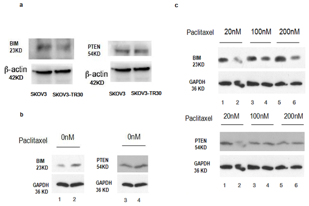 BIM is a member of the BH3-only family of pro-apoptotic proteins and is expressed in a wide variety of tissues. BIM can initiate apoptosis by directly activating Bax through interaction with the Bcl-2/Bax herterodimer complex, which can further induces mitochondrial cell death [,]. It plays a critical role in tumor cell biology, including the regulation of tumorigenesis through activities as a tumor suppressor, tumor metastasis, and tumor cell survival. Therefore, it has gradually become an interesting target for cancer chemotherapy. PTEN plays a well-established role in the negative regulation of the PI3K pathway, which is frequently activated in several cancer types, including ovarian cancer. PTEN loss of function occurs in a wide spectrum of human cancers through mutations, deletions and transcriptional silencing. The expression of BIM and PTEN is highly regulated by its transcriptional and post-translational levels.