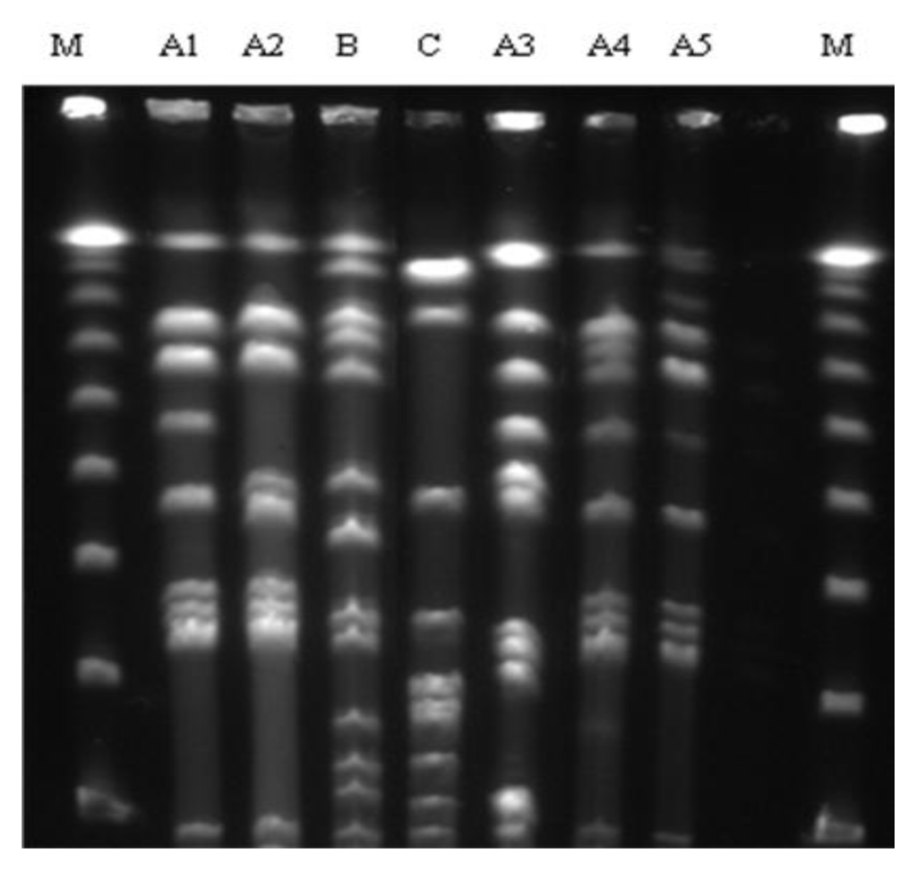 - Tenover, F.C.; Arbeit, R.D.; Goering, R.V.; Mickelsen, P.A.; Murray, B.E.; Persing, D.H.; Swaminathan, B. Interpreting chromosomal DNA restriction patterns produced by pulsed-field gel electrophoresis: Criteria for bacterial strain typing. J. Clin. Microbiol 1995, 33, 2233–2239. [Google Scholar]