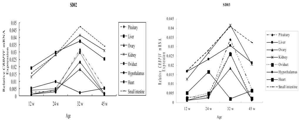 To determine if the CRBP IV mRNA expression shows tissue- and development-specific expression, we investigated its expression in eight tissues from two different chicken lines at four ages (12 w, 24 w, 32 w and 45 w). As shown in Figure 2, the ontogenic expression of CRBP IV mRNA showed similar profiles in all tissues of line SD02 and line SD03. Specifically, CRBP IV gradually increased in the pituitary, oviduct, hypothalamus and ovary tissue from 12 w to 24 w and then rapidly rose to its peak expression at 32 w. Gene expression then declined from 32 w to 45 w. In the kidney, liver, and small intestine of both lines, the expression of CRBP IV mRNA rapidly increased from 12 w to 32 w and subsequently declined to 45 w. In the heart, highest CRBP IV mRNA expression was found at 24 w and lowest expressions at 32 w in both lines.