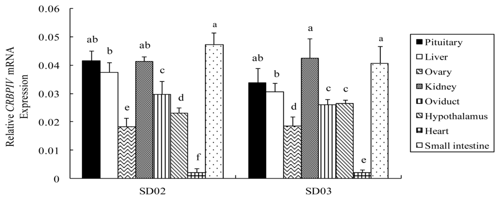 CRBP IV mRNA was expressed in all of the examined tissues, but the expression pattern was not similar to other species. Human CRBP IV mRNA was expressed widely in many tissues with the greatest abundance in the adult kidney, and also highly expressed in adult heart, adult transverse colon, fetal heart, and fetal spleen []. The mRNA expression level of porcine CRBP IV was highest in the liver, followed by spleen, large intestine, and lymph node. Expression was weak in the heart, lung, intestine, kidney, and fat []. The house mouse CRBP IV mRNA was highly expressed in white adipose tissue and mammary gland, but low in heart, kidney, and brain []. In our study, CRBP IV was highly expressed in the small intestine and liver, which is consistent with the report that retinol is absorbed in the small intestine and stored in liver []. Why CRBP IV mRNA was abundant in kidney may also be due to vitamin A metabolism being regulated by kidneys []. Because vitamin A plays a very important role in the hypothalamus-pituitary-ovary axis [,], high CRBP IV expression in pituitary, hypothalamus, ovary, and oviduct was expected.