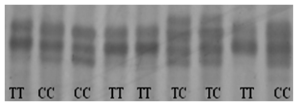 Electrophoregrams of the polymorphic patterns for c. 826T>C. The three genotypes of CC, TC, and TT were marked in lanes, respectively.