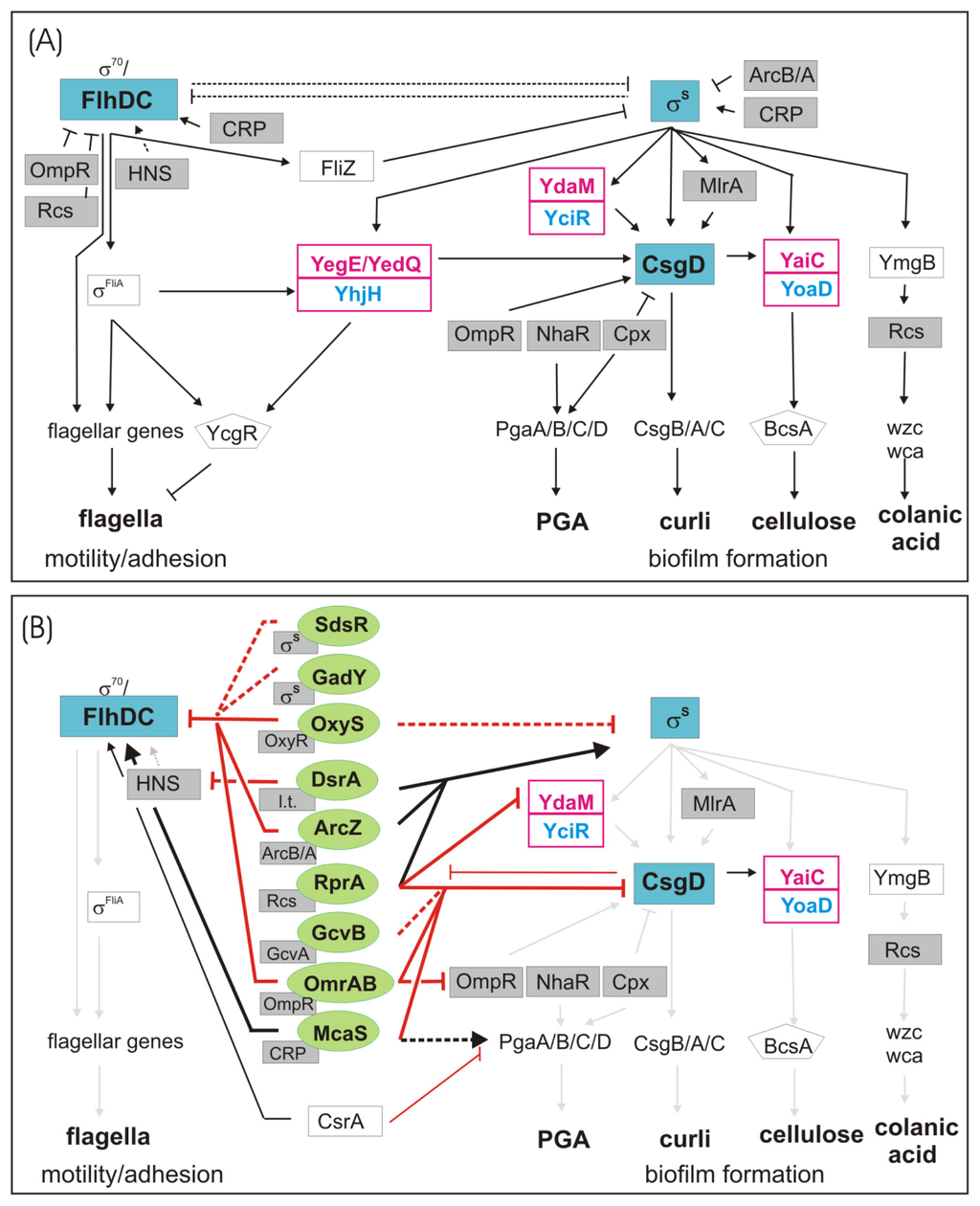 Other components of the E. coli biofilm matrix like colanic acid and PGA are not affected by the curli/cellulose control cascade, but also belong to regulons of biofilm-associated transcription factors (Figure 1A). Colanic acid production depends on the two-component phosphorelay system RcsC/RcsD/RcsB, which can sense perturbations in the cell envelope and seems to play a role in biofilm maturation [,]. In part by cooperating with various other transcription factors, the phosphorylated response regulator RcsB not only activates the genes involved in colanic acid, but also stimulates the expression of the sRNA RprA and many other target genes [–]. In addition, RcsB inhibits flhDC expression and thereby exerts a negative effect on motility []. σS modulates the Rcs system by controlling the expression of the small protein YmgB, which stimulates activity of the Rcs system [,]. Overall, the Rcs system seems to inversely regulate flagella expression and late biofilm functions.