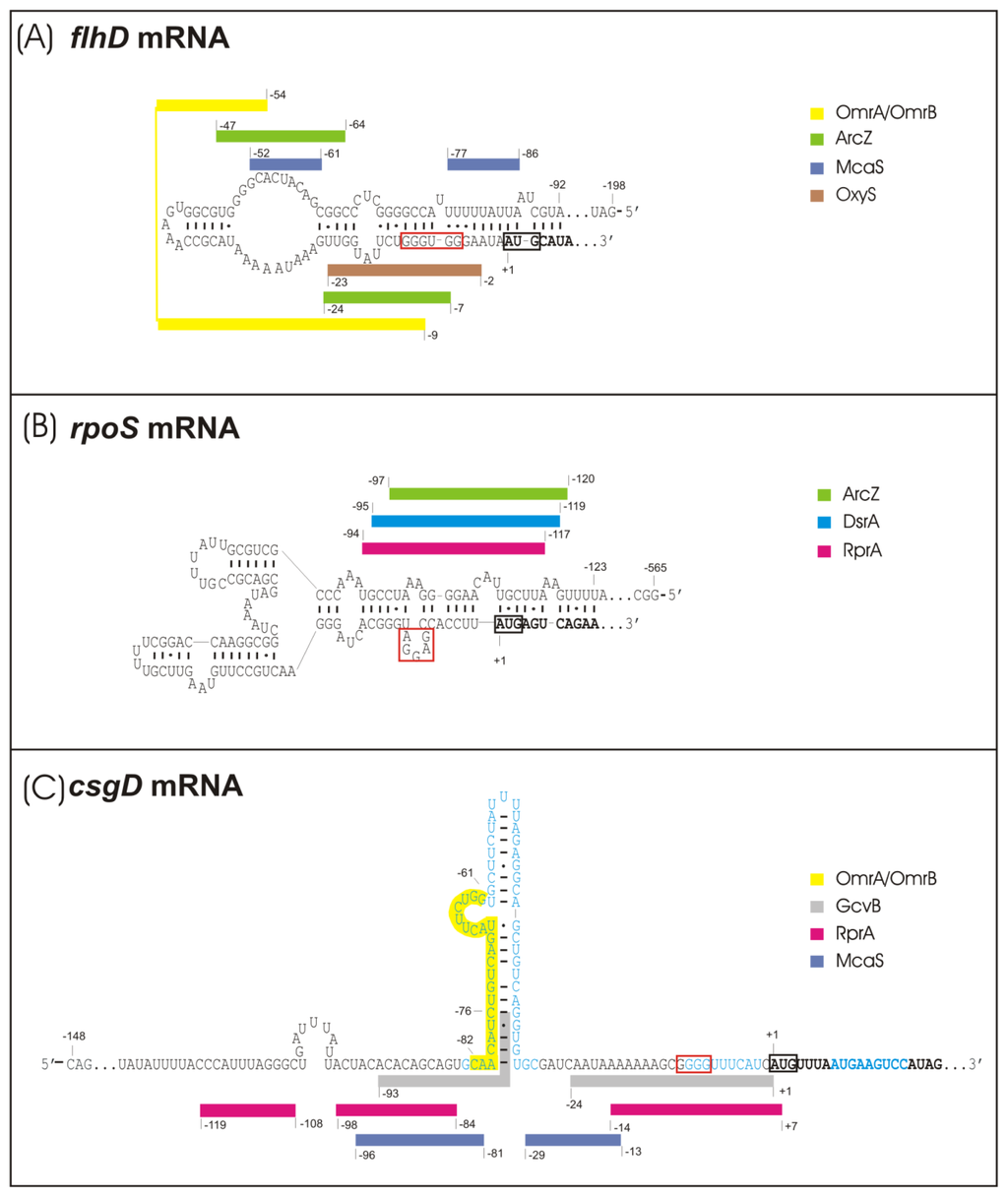 “hub” mRNAs—secondary structures of relevant 5′UTR parts and sRNA binding sites. (A) Structure prediction of flhD 5′UTR []. (B) Predicted and mapped structure of rpoS 5′UTR [] (C) Predicted and mapped structure of csgD 5′UTR []. sRNA binding sites were computationally predicted and proven by compensatory basepair exchanges (all except GcvB) [,–,,–] or mapped [,]. Positions on the mRNA sequence are numbered according to the transcriptional start site. Bold nucleotides: coding region; black box: start codon; red box: Shine Dalgarno Sequence; colored bars: sRNA binding sites; blue nucleotides: unfolded stem loop structures.