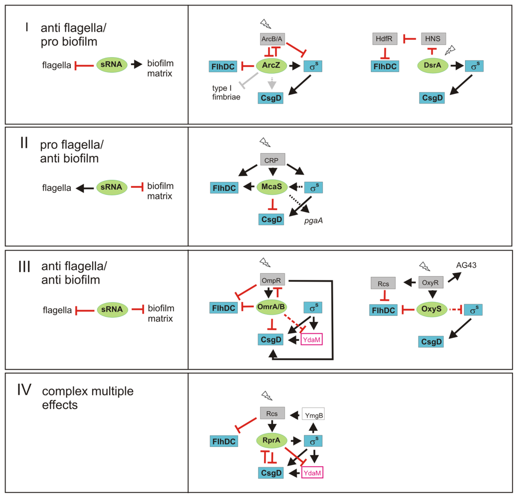 sRNAs are key players in several types of regulatory ‘motifs’, that generate distinct physiological outputs (Figure 3): Group I sRNAs stimulate biofilm functions and down-regulate flagella; Group II sRNAs have the opposite impact, i.e., stimulate flagella expression, but interfere with the synthesis of biofilm matrix; Group III sRNAs downregulate both functions; and finally Group IV is defined by sRNAs with multiple and more complex roles in the control of flagella and biofilm functions.