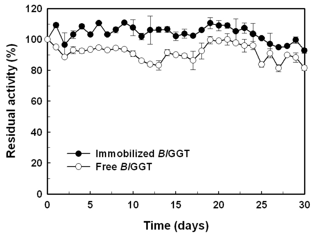 The operational stability was assessed for the immobilized BlGGT (~1.2 g, wet weight) during storage in 100 mL of 20 mM Tris-HCl (pH 8.0) at 4 °C. At a specific time interval, aliquots (1 mL) were withdrawn to determine the GGT activity under the standard assay conditions. The experiments were performed in triplicate, and the data were expressed as mean values.