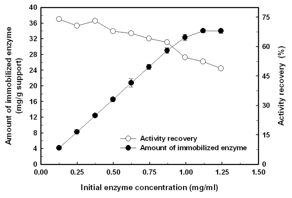 The effect of the initial BlGGT concentration on the amount of the biocatalyst covalently attached on the surface-modified magnetic nanoparticles and recovery of the enzymatic activity are shown in Figure 2. The amount of immobilized enzyme almost proportionally increased with the increment of initial enzyme concentration in the bulk solution from 0.125 to 0.875 mg/mL and then leveled off. Eventually, the maximum loading for BlGGT could reach 34.2 mg/g of support, which corresponds to an activity recovery of 52.4%. The activity recovery of BlGGT, defined as the ratio of the GGT activity of immobilized enzyme to the initial activity, was almost kept unchanged in the low range of initial enzyme concentration (0.125–0.375 mg/mL). However, a further increase in the initial enzyme concentration led to the reduction of activity recovery. The possible explanation for this phenomenon is that the multiple layers of enzyme molecules on the surface of magnetic nanoparticles are formed at high enzyme loading, which might block the active sites of the enzyme and cause the diffusion limitation of the substrate.
