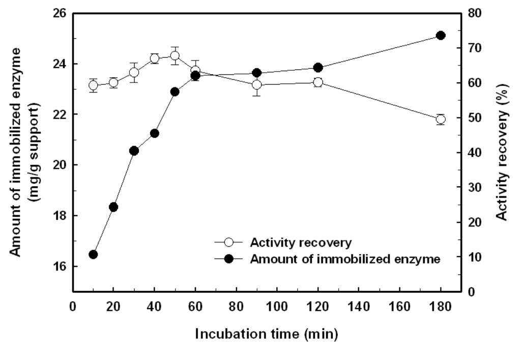 The effect of coupling time on the immobilization efficiency of BlGGT on the 3-aminopropyltriethoxysilane (APES)-modified magnetic nanoparticles is presented in Figure 3. The amount of immobilized enzyme was increased with the increment of coupling time, reaching a plateau after 1 h and the maximum amount of enzyme immobilization was determined to be 25.1 mg/g of support. The activity recovery of immobilized BlGGT maintained almost constant at about 57.7% for the first 50 min and then gradually decreased when the incubation time went further. A long immobilization time resulted in lower activity recovery, which could be the result of the creation of additional multiple covalent linkages between the nanoparticles and the enzyme, and, in turn, disturbs the structural conformation of the biocatalyst.