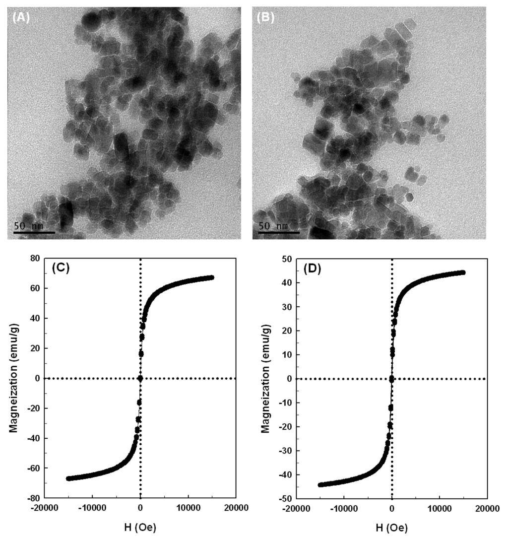 Transmission electron microscopy (TEM) micrographs (A) and (B) and magnetization curves (C) and (D) of Fe3O4 and Fe3O4/APES/BlGGT. Panels represent: (A) and (C), naked Fe3O4; (B) and (D), Fe3O4/3-aminopropyltriethoxysilane (APES)/BlGGT.