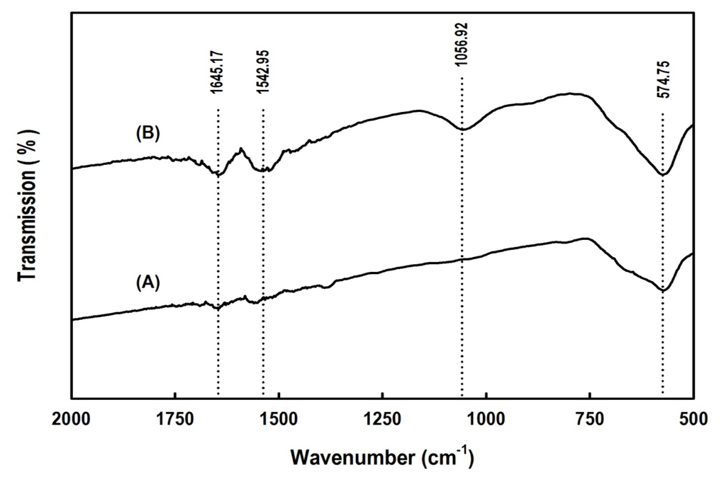 The cross-linking of BlGGT to the aldehyde-functionalized magnetic nanoparticles was also confirmed by FTIR analysis. Figure 5 shows the FTIR spectra of naked Fe3O4 and Fe3O4/APES/BlGGT. The peak at 569 cm−1 relates to the Fe–O group of Fe3O4. Compared with the spectrum of naked Fe3O4, the characteristic bands appear at 1542.95 and 1645.17 cm−1 in Fe3O4/APES/BlGGT and can be assigned to the NH and NH2 bending vibration, respectively. These results indicate that the BlGGT molecules are conjugated with the APES-modified magnetic nanoparticles successfully.