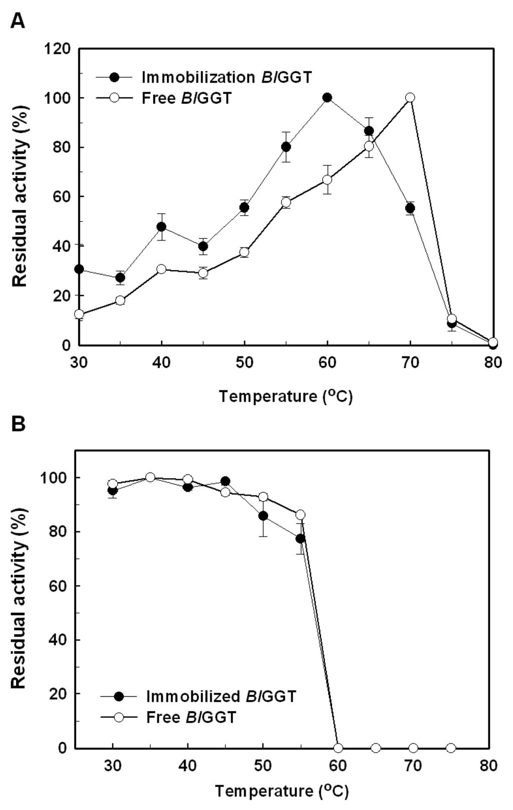 The effect of temperature on free and immobilized enzymes was evaluated by incubating free BlGGT (8.7 U/mL) and BlGGT-conjugated magnetic nanoparticles (34.1 mg; wet weight) in 10 mL of 20 mM Tris-HCl buffer (pH 8.0) at various temperatures (30–80 °C) for 10 min. The amount of GGT activity was determined according to the assay procedure described above. The thermal stability of free and immobilized enzymes was performed in 10 mL of 20 mM Tris-HCl buffer (pH 8.0) at different temperatures (30–80 °C). After 30 min of incubation, the residual activity was determined under the standard assay conditions. The experiments were performed in triplicate, and the data were expressed as mean values.