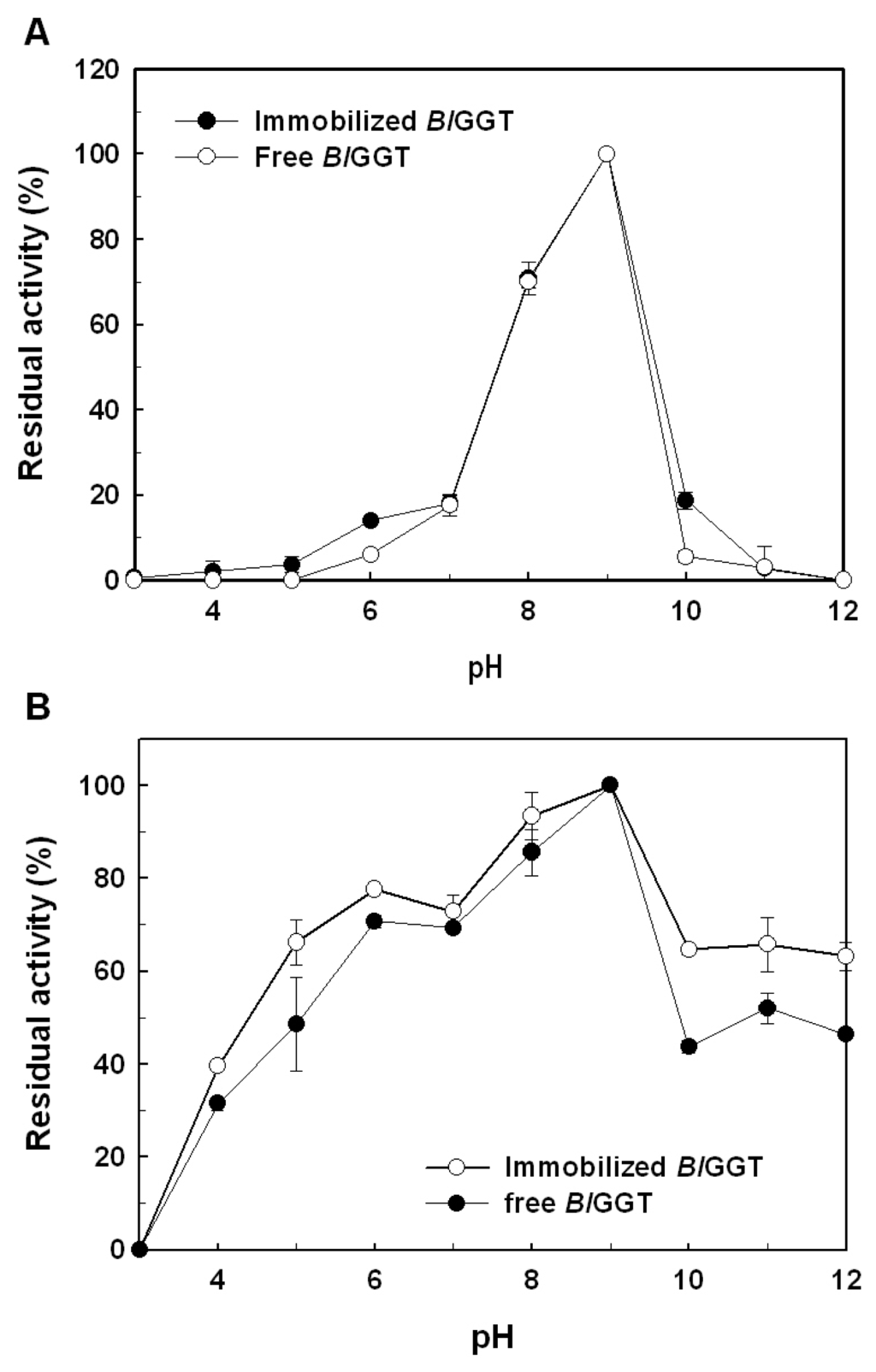 To investigate the pH effect on free and immobilized enzymes, BlGGT (8.7 U/mL) and BlGGT-conjugated magnetic nanoparticles (34.1 mg; wet weight) were incubated with 10 mL of 20 mM Tris-maleate buffer (pH 4.5–6.0), 20 mM potassium phosphate buffer (pH 6.0–8.0), 20 mM Tris-HCl buffer (pH 8.0–9.0) or 20 mM glycine-NaOH buffer (pH 9.0–11.0) at 60 °C, and the amount of GGT activity was determined according to the standard assay conditions. For the measurement of pH stability, both free and immobilized enzymes were kept at 4 °C for 30 min in different buffers. The residual GGT activity was determined under the standard assay conditions. The experiments were performed in triplicate, and the data were expressed as mean values.