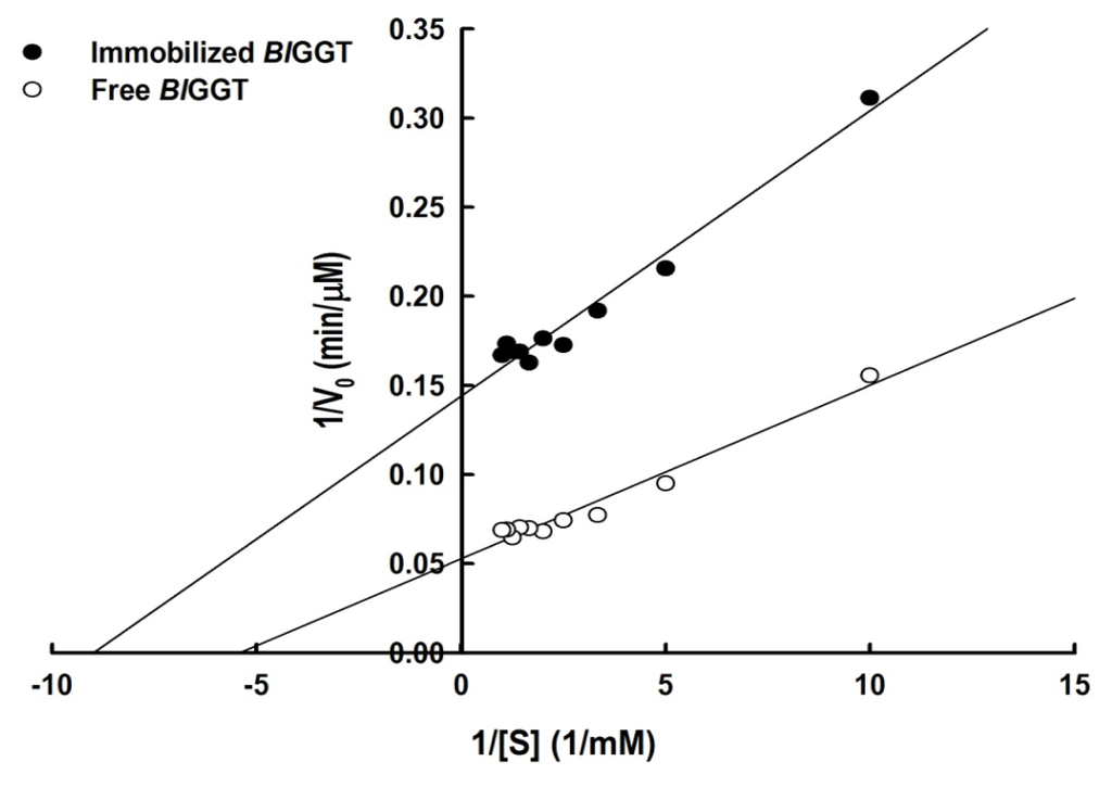 Lineweaver-Burk plots for free and immobilized enzymes on the transpeptidation reaction of l-γ-Glu-p-NA were used to obtain kinetic parameters (Figure 8). The Michaelis–Menten constants, KM and Vmax, for free enzyme were 0.18 mM and 18.94 μmol/min/mg, respectively. The immobilized BlGGT had an apparent KM of 0.11 mM and a Vmax value of 7.01 μmol/min/mg, leading to a reduction of the catalytic efficiency (Vmax/KM) from 10.51 to 3.05 s−1. These observations indicate that the immobilization process significantly reduces the substrate affinity of BlGGT and may also hinder the accessibility of reactants to the active site. These results are consistent with the kinetic observations of other enzymes immobilized on magnetic nanomaterials [37,43,46–48].